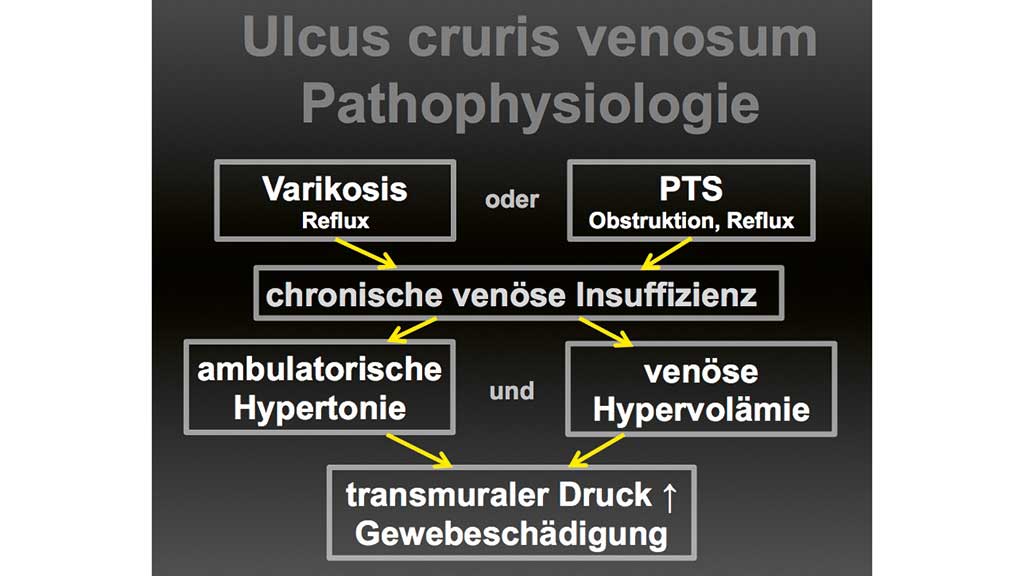Ein spezielles Krankheitsbild ist das UCV. Hier kommt es im fortgeschrittenen Stadium der CVI – in der Regel verursacht durch eine Varikosis oder ein postthrombotisches Syndrom – durch die ambulatorische venöse Hypertonie und Hypervolämie zu einem pathologischen Anstieg des transmuralen Drucks, der über die progrediente Gewebeschädigung zum Gewebeuntergang führt – das Ulcus cruris venosum (Abb. 2). Wichtigste Therapiemaßnahme bei dieser pathologischen Druckerhöhung ist Gegendruck und somit die effektive Kompressionstherapie.