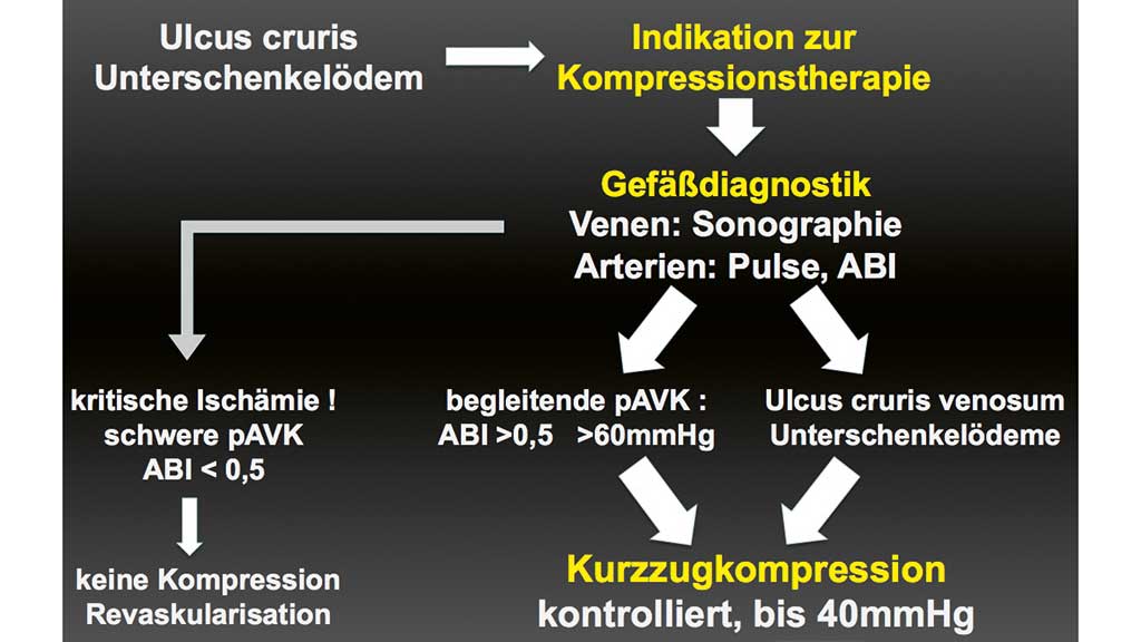 Die medizinische Kompressionstherapie der Unterschenkel ist ein wichtiger Therapiepfeiler der gesamten Gefäßmedizin. Als mögliche Kontraindikation gilt es, die periphere arterielle Verschlusskrankheit (PAVK) zu diagnostizieren und zu bewerten. Nur die fortgeschrittene PAVK mit kritischer Ischämie stellt eine Kontraindikation zur Kompressionsbehandlung dar. Somit ist bei vielen Patienten mit guter Indikation zur Kompression und begleitender PAVK eine kontrollierte und effektive Kompressionstherapie bis 40 mmHg möglich.