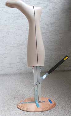 Hirai und Mitarbeiter in Japan haben ein einfaches Verfahren entwickelt, um die Stiffness von Strümpfen und Bandagen zu messen 6. Dabei handelt es sich um ein Modellbein mit einem Schlitz in Längsrichtung, welcher durch einen Hebel um 0,5 cm verbreitert werden kann, sodass der Umfang des Beinmodells um 1 cm wächst (Abb. 1). Wird ein Kompressionsstrumpf oder ein Verband über das Modell appliziert, so kann nicht nur der Ruhedruck, sondern auch die Druckzunahme bei einer Querdehnung um 1 cm gemessen werden, die definitionsgemäß der Stiffness entspricht.