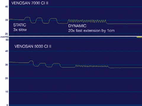 Abbildung 2 zeigt Druckkurven unter 2 Strumpfmodellen, die praktisch denselben Ruhedruck um 30 mmHg ausüben, sich aber bezüglich der Amplitudenhöhen bei Umfangzunahme des Modellbeins um 1 cm (= Stiffness) klar unterscheiden. Der Druckanstieg ist beim oberen Modell deutlich höher, auch wenn durch schnelle Hebelbewegungen Gehen simuliert wird. Die höheren Druckamplituden bewirken einen stärkeren Massageeffekt beim Gehen, der dem Anwender mangels einer entsprechenden Kennzeichnung auf der Verpackung verborgen bleibt.