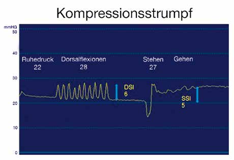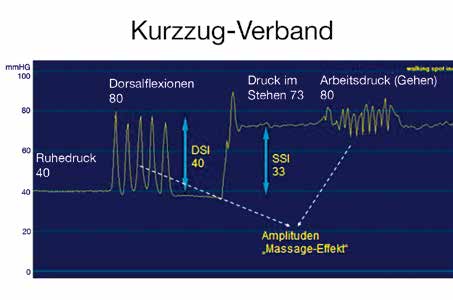 Mittels Magnetresonanz-Untersuchungen im Stehen 21 konnte gezeigt werden, dass in der Regel erst Drücke über 70 mmHg zu einer Veneneinengung führen, welche die Voraussetzung für eine hämodynamische Wirksamkeit darstellt. Derartig hohe Druckwerte werden vom Patienten nur mit Kompressionsmitteln toleriert, die eine hohe Stiffness aufweisen. Solche Systeme können auch als „intelligente Kompression” bezeichnet werden, da sie in Ruhe tolerierbare Drücke aufweisen und sich beim Aufstehen automatisch an das Erfordernis anpassen, dem hydrostatisch bedingt höheren intravenösen Druck entgegenzuwirken. Wollte man derartig hohe Drücke mit elastischem Material erzielen, müssten Ruhedrücke von über 60 mmHg angewendet werden, was aufgrund der elastischen Rückstellkraft nicht toleriert würde. Gleichzeitig werden unter den hohen Drücken im Stehen pathologische venöse Refluxe bei Venenklappeninsuffizienz reduziert 22. Verbände mit hoher Stiffness bewirken im Gehen eine intermittierende Veneneinengung jeweils am Höhepunkt der Muskelanspannung, wodurch vermehrt Blut hochgepumpt wird 23. Nachdem die Wadenmuskelvenen wesentlich mehr Blut speichern als die distalen Unterschenkelvenen, bewirkt ein höherer Druck über der Wadenmitte eine ausgeprägtere Zunahme der venösen Pumpleistung als ein graduierter Druckverlauf 24. Ein Anstieg der Auswurfleistung der venösen Wadenmuskelpumpe konnte auch bei venengesunden Sportlern gezeigt werden, wenn unnachgiebige VelcroBänder über Sportstrümpfe gewickelt werden 25.