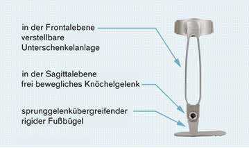 Die biomechanischen Resultate und Überlegungen führten zur finalen Konstruktionsgestaltung der Agilium-Freestep-Orthese. Die Berücksichtigung einer Außenranderhöhung ist dabei nicht erforderlich, da, wie sich in ergänzenden Untersuchungen zeigte, der Haupteffekt nicht aus der „Verkippung“ des Fußes resultiert. Die technischen Hauptmerkmale sind ein sprunggelenksübergreifender rigider Fußbügel, ein in der Sagittalebene frei bewegliches Knöchelgelenk und eine in der Frontalebene verstellbare Unterschenkelanlage (Abb. 3).