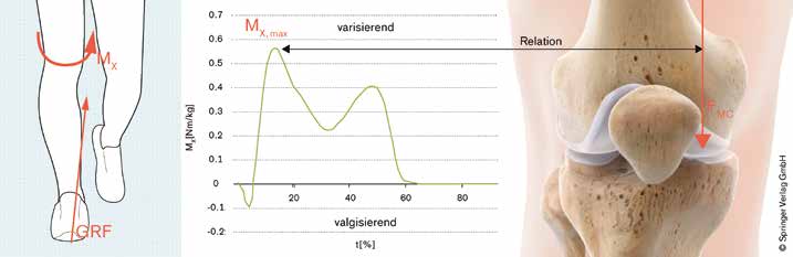 Physiologisch betrachtet verläuft unter Belastung beim Gehen der Bodenreaktionskraftvektor in der Frontalebene medial der Kniegelenkmitte, wodurch ein varisierendes Moment wirkt. Der Maximalwert wird während der Gangphase „Loading Response“ gemessen und liegt durchschnittlich bei etwa 0,5 Nm/kg. Bei einem Varusgonarthrosepatienten ist dieser Wert häufig erhöht, bei einem Valgusgonarthrosepatienten meist deutlich verringert. Studien belegen, dass das varisierende Moment direkt mit der Gelenkkontaktkraft korreliert und somit als gut messbarer Belastungsindikator angesehen werden kann 14 (Abb. 1).