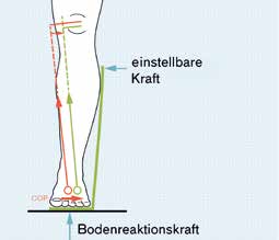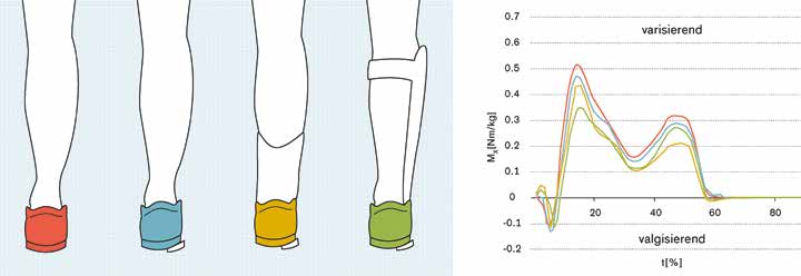 Die eindeutig messbare Wirkung wird durch zwei Effekte erreicht: Aufgrund der rigiden Überbrückung des unteren und oberen Sprunggelenkes wird zunächst die Eversionsbewegung des Fußes in der Standphase reduziert. Des Weiteren wirkt eine einstellbare Kraft über die laterale Anlage auf den Unterschenkel ein. Beide Mechanismen führen zu einer Verschiebung der Bodenreaktionskraft in lateraler Richtung und somit zu einer Verringerung des wirksamen Hebelarms am Kniegelenk. Das externe frontale Kniedrehmoment reduziert sich signifikant, was mit der oben beschriebenen Entlastung des medialen Knie-Kompartiments korreliert 161718 (Abb. 4). Zur Behandlung der Valgusgonarthrose (laterale Arthrose) ist die Orthese mit medialer Schienenführung erhältlich. Hier ist das Ziel, die Bodenreaktionskraft in mediale Richtung zu verschieben.