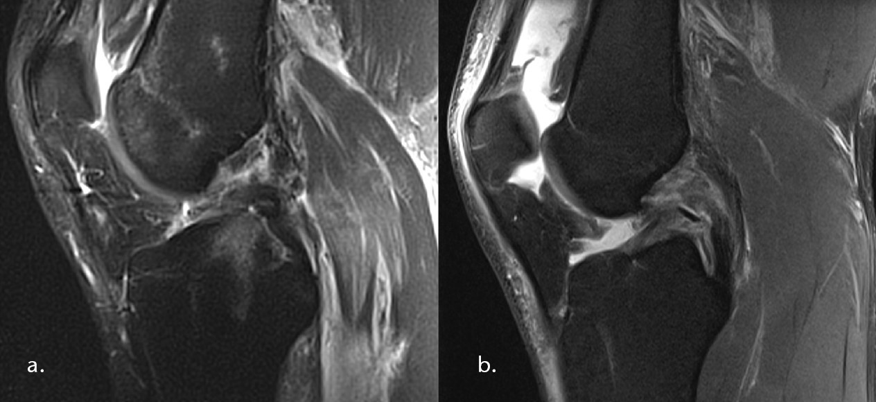 Vor allem iso­lier­te HKB-Ver­let­zun­gen eig­nen sich zur kon­ser­va­ti­ven Behand­lung. Bei zusätz­li­cher Ver­let­zung z. B. des pos­te­ro­la­te­ra­len Ecks und somit kon­se­ku­tiv erhöh­ter Insta­bi­li­tät soll­te jedoch viel­mehr ein ope­ra­ti­ver The­ra­pie­an­satz gewählt wer­den1 2. In der Ver­gan­gen­heit hat sich zur Ein­tei­lung wei­test­ge­hend die Hugh­s­ton-Klas­si­fi­ka­ti­on durch­ge­setzt, wel­che iso­liert nach der Laxi­tät (instru­men­tell oder radio­lo­gisch gemes­sen) ein­teilt3. Grad-I- und ‑II-Ver­let­zun­gen mit einer hin­te­ren Schub­la­de von < 10 mm spre­chen für ein kon­ser­va­ti­ves Vor­ge­hen. Grad-III-Ver­let­zun­gen mit einer > 10 mm Schub­la­de sug­ge­rie­ren eine zusätz­li­che Ver­let­zung des pos­te­ro­la­te­ra­len Ecks. Ago­l­ley (2017) zeig­te bei kon­ser­va­ti­ver The­ra­pie die­ser Grad-III-Ver­let­zun­gen zwar ein hohes Return-to-Sports und einen Teg­ner-Score von 9, eine sta­bi­le Kon­so­li­die­rung des HKBs konn­te jedoch nicht erreicht wer­den4. Die struk­tu­rel­le liga­men­tä­re Sta­bi­li­tät des Gelen­kes ist jedoch ein wesent­li­cher Fak­tor für die Auf­recht­erhal­tung des Knor­pel­sta­tus. Bei Insuf­fi­zi­enz des HKB kommt es zu erhöh­ten Kon­takt­drü­cken im media­len und patell­ofe­mo­ra­len Kom­par­ti­ment von bis zu 52 %5 6. Neben der rei­nen Laxi­zi­tät soll­te auch die Rup­tur­mor­pho­lo­gie im MRT als kon­ser­va­ti­ves Ent­schei­dungs­kri­te­ri­um mit her­an­ge­zo­gen wer­den, da es Rup­tur­for­men gibt, wel­che nicht oder schlecht kon­ser­va­tiv kon­so­li­die­ren kön­nen. Hier­zu zäh­len z. B. dis­lo­zier­te femo­ra­le Abris­se (Abb. 1a) oder knö­cher­ne tibia­le Aus­ris­se mit einer Dis­lo­ka­ti­on von > 6,7 mm7. Wesent­lich ist der intak­te Syn­ovi­al­schlauch als Leit­struk­tur für das geris­se­ne Liga­ment (Abb. 1b). Auch haben sich mitt­ler­wei­le mini­mal­in­va­si­ve (arthro­sko­pi­sche) ope­ra­ti­ve Tech­ni­ken ent­wi­ckelt, wel­che die Refix­a­ti­on erleich­tern und gleich­zei­tig sehr gute kli­ni­sche Ergeb­nis­se errei­chen las­sen8 9. Da sowohl die kon­ser­va­ti­ve Behand­lung als auch die ope­ra­ti­ve Nach­be­hand­lung mit einem hohen zeit­li­chen Auf­wand ver­bun­den sind, soll­te ein „Wir ver­su­chen es mal“ mög­lichst ver­mie­den wer­den. Die früh­zei­ti­ge Ein­lei­tung der adäqua­ten Ver­sor­gung, sowohl kon­ser­va­tiv als auch ope­ra­tiv, ist essen­ti­ell wichtig.