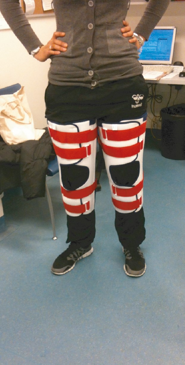 Auch in der Orthe­sen­ver­sor­gung ist der PTS die wesent­li­che Funk­ti­on, da 24/7 eine Unter­stüt­zung des HKB vor­lie­gen soll­te. Jung (2008) konn­te in einer ers­ten Stu­die mit einer 6‑wöchigen Ruhig­stel­lung in einem Gips­cast mit PTS-Modul eine Ver­bes­se­rung der hin­te­ren Schub­la­de von 6,2 auf 3 mm und eine deut­li­che Ver­bes­se­rung des sub­jek­ti­ven IKDC auf 90.3 ± 4.2 zei­gen18. Dies führ­te zu der heu­ti­gen „Standard“-Therapie mit initia­ler Ruhig­stel­lung für 6 Wochen in einer star­ren PTS-Schie­ne unter Soh­len­kon­takt und anschlie­ßend wei­te­rer Ver­sor­gung mit einer beweg­li­chen Orthe­se für wei­te­re 6 Wochen unter Voll­be­las­tung. Die sich hier­aus erge­ben­den Pro­ble­me sind offen­sicht­lich. Es kommt zu einer deut­li­chen mus­ku­lä­ren Atro­phie und einem Funk­ti­ons­de­fi­zit. Eine lan­ge Reha­bi­li­ta­ti­ons­pha­se ist vor­pro­gram­miert. Somit kommt es auch zu einem erheb­li­chen beruf­li­chen und sport­li­chen Aus­fall und zu guter Letzt zu hohen direk­ten und indi­rek­ten Krank­heits­kos­ten. Die­ses Kon­zept steht und fällt vor allem auch mit der Pati­en­ten­com­pli­ance (Abb. 3), wel­che auf eine har­te Pro­be gestellt wird. Wün­schens­wert ist also eine früh­zei­ti­ge funk­tio­nel­le Behand­lung mit beweg­li­chen Orthe­sen. Die ers­ten Ansät­ze mit sta­ti­schem PTS, wel­cher zum Teil auch stu­fen­wei­se ein­stell­bar war, führ­te bereits zu guten kli­ni­schen Ergeb­nis­sen, wenn auch nicht phy­sio­lo­gi­scher Wie­der­her­stel­lung der Sta­bi­li­tät19. Dies ist dem Fakt geschul­det, dass das HKB über den Fle­xi­ons­zy­klus einer linea­ren Deh­nungs- und Span­nungs­zu­nah­me unter­liegt20 21. Ein sta­ti­scher Sup­port ist nicht in der Lage, die­sen bei Bewe­gung zu kom­pen­sie­ren. Der aktu­el­le Ansatz liegt im dyna­mi­schen Sup­port, wel­cher bei zuneh­men­der Fle­xi­on eben­falls zunimmt (Abb. 4). Bis­he­ri­ge Stu­di­en zu 2 sol­chen Orthe­sen-Model­len zeig­ten in der sta­ti­schen Auf­nah­me bei 90° einen guten, wenn auch nicht opti­ma­len Sup­port22. In der kli­ni­schen Anwen­dung mit natür­li­chen Bewe­gungs­ab­läu­fen konn­te die Funk­ti­ons­wei­se bestä­tigt und der Vor­teil gegen­über einem sta­ti­schen Sup­port gezeigt wer­den23. Da Unter­su­chun­gen jedoch auch gezeigt haben, dass die Deh­nung des HKB bei über 90° Fle­xi­on auf bis zu 108 % zunimmt und bei Bewe­gung wie Sprung, Cut­ting oder auch Seit­schrit­ten auf bis zu 123 ± 12 % ansteigt, soll­ten die­se Bewe­gun­gen und auch Fle­xio­nen über 90° in den initia­len 6 Wochen wei­ter­hin ver­mie­den wer­den24 25. Ob der dyna­misch anstei­gen­de Sup­port auch die Län­gen­zu­nah­me des HKB aus­glei­chen kann, ist frag­lich und bis­her auch nicht unter­sucht. Hin­zu kommt, dass bei Fle­xio­nen über 90° Kom­pres­si­ons­drü­cke von bis zu 160 N gemes­sen wor­den sind26. Auch hier­bei ist frag­lich, ob dies vom Pati­en­ten auf Dau­er tole­riert wird.