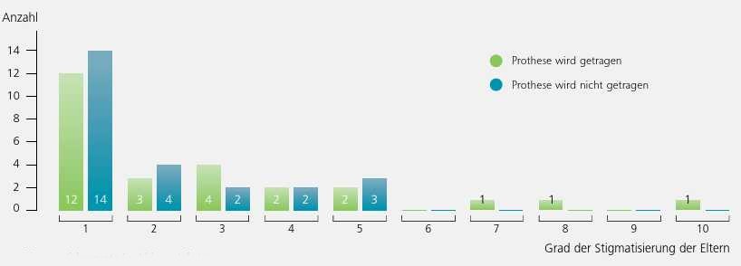 Bei einem geringen Grad der Stigmatisierung der Eltern wird die Prothese fast zu gleichen Teilen getragen oder abgelehnt. Bei einem sehr hohen Grad der Stigmatisierung wird die Prothese eher getragen. Es ist jedoch darauf hinzuweisen, dass die Fallzahlen relativ gering sind und somit eventuell eine zufällige Konstellation darstellen könnten.