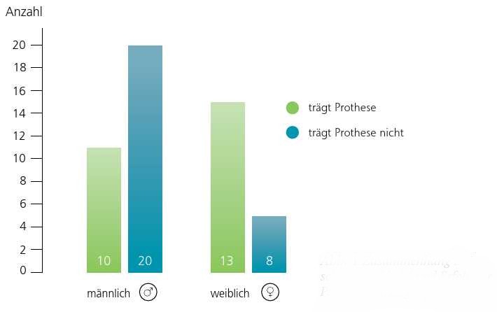 Das Geschlecht der Patienten hat Einfluss auf die Prothesenakzeptanz: 62 % der weiblichen Patienten tragen ihre Prothese, aber nur 33 % der männlichen Patienten (Abb. 1).