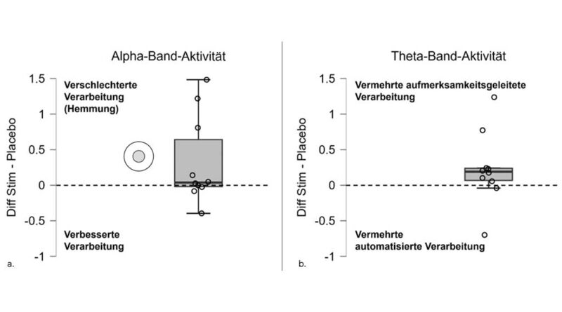 Untersucht wurden zwei spezifische Frequenzbänder der Hirnaktivität, die im Zusammenhang sensomotorischer Regelprozesse stehen – das Alpha- und das Theta-Band. Abbildung 2a zeigt den Vergleich zwischen den sensomotorischen Einlagen (Stim) und den Placeboeinlagen im Alpha-Band. Negative Werte stehen für eine gesteigerte Aktivierung (bessere sensomotorische Verarbeitung), Positive für eine Hemmung. Bei einigen Personen führte das Tragen der Stim-Einlagen tendenziell zu einer Hemmung der sensomotorischen Verarbeitung. Statistisch ließ sich jedoch weder ein positiver noch ein negativer Effekt eindeutig nachweisen (W = 19; p = .171; Rangkorrelation = .583).