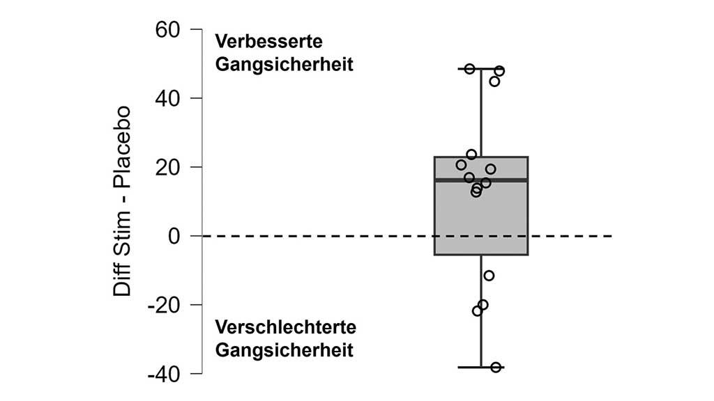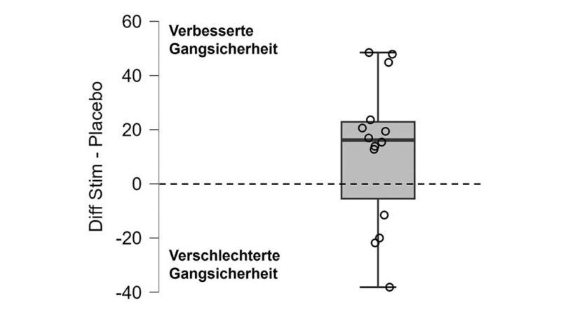 Abbildung 2b zeigt die Aufmerksamkeit beim Gehen (ebenfalls Vergleich Stim vs. Placebo). Die meisten Teilnehmenden verwendeten mit den sensomotorischen Einlagen mehr kognitive Ressourcen (positiv), was auf eine weniger automatisierte Gangkontrolle hindeutet. Der Unterschied verfehlte knapp die statistische Signifikanz (W = 21; p = .067; Rangkorrelation = .75).