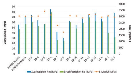 Neben dem Epoxidharz von Ottobock – das alte Araldit 617H4 – werden zwölf weitere Epoxidharzsysteme sowie drei Vinylestersysteme unterschiedlicher Firmen betrachtet. Die mechanischen Kennwerte „Zugfestigkeit“, „Bruchfestigkeit“ und „E‑Modul“ der Epoxid- und Vinylestersysteme sind in Abbildung 2 dargestellt; die anderen Werte wie „Schlagzähigkeit“ und „Dehnung“ werden in Abbildung 3 analysiert.