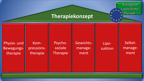 Das von der europäischen Expertengruppe entwickelte Therapiekonzept des Lipödems (Abb. 8) umfasst sechs Therapiesäulen: