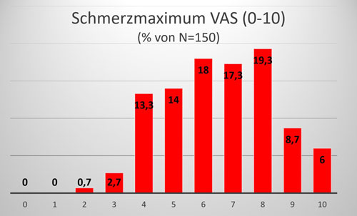 - Das aktuelle Schmerzmaximum im Alltag (Abb. 1) liegt bei knapp 70 % der Patientinnen bei 6 oder mehr auf der VAS. Maximale Schmerzen der Stärke 9 bis 10 werden immer noch von 14,7 % der Befragten angegeben.