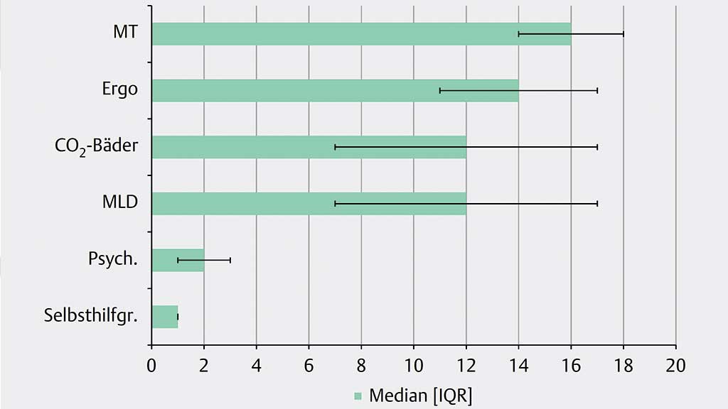 Die ambulante Interimsphase dauerte durchschnittlich 41 Tage (Range: 21–69 Tage; Stdw.: 15 Tage). Die behandelten Patient:innen erhielten im Durchschnitt 59 ärztlich verordnete Therapieeinheiten bei Bedarf inkl. psychologischer Gespräche, Selbsthilfegruppe und Berufsberatung (Range: 11–109 Einheiten; Stdw.: 27 Einheiten). Die eingesetzten Heilmittel waren MT, KG, KGG, MLD, KMT, CO2 und sensorisch-perzeptive Ergotherapie (Abb. 1 und Tab. 4). Zusätzlich zu den Therapieeinheiten gab es eine ärztliche Eingangs- und Abschlussuntersuchung (inkl. Assessment), Teambesprechungen und regelmäßige ärztliche Therapievisiten. Im gesamten Zeitraum erfolgten regelmäßige Teambesprechungen und Therapievisiten. Bei volumenkonstantem Stumpf wurde in enger Zusammenarbeit mit dem jeweiligen orthopädietechnischen Unternehmen innerhalb dieser Zeit die Interimsprothese angepasst und fertiggestellt. Im Durchschnitt lagen ca. sieben Wochen zwischen der Operation und fertiggestellter Interimsprothese (Range: 4 – 13 Wochen; Stdw.: 2). Der überwiegende Teil der Teilnehmer:innen verfügte am letzten Tag der ambulanten Intervention über einen Mobilitätsgrad von 2 (eingeschränkter Außenbereichsgeher). Von den Oberschenkelamputierten erhielten vier ein elektronisches und zwei ein mechanisches Kniegelenk.