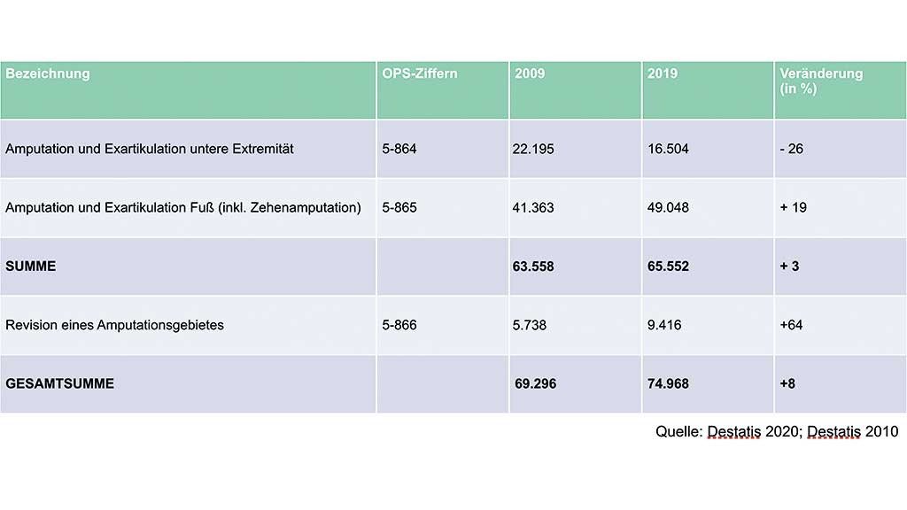 Wenngleich die Anzahl der hohen Amputationen der unteren Extremitäten in Deutschland erfreulicherweise rückläufig ist (26 %), so ist demgegenüber die Gesamtanzahl an Amputationen der unteren Extremitäten im selben Zeitraum leicht gestiegen (+8 %). Dies ist vor allem durch die Zunahme von Fuß- und Zehenamputationen bedingt (+19 %). Auffallend und kritisch zu hinterfragen ist der hohe Anstieg an Revisionsoperationen (+64 %) im betrachteten Zehnjahreszeitraum (Tab. 1).