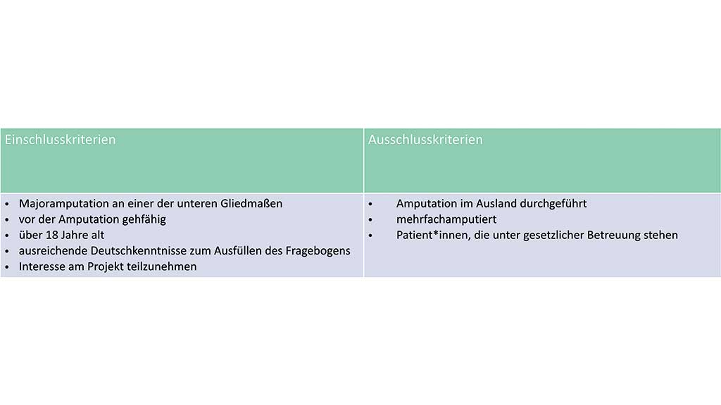 Die Rekrutierung der Teilnehmer:innen beschränkte sich auf 14 Kliniken für Gefäß- sowie Unfallchirurgie und Orthopädie, die sich in einem Radius von 50 Kilometern um die Hochschulambulanz befanden und einen entsprechenden Kooperationsvertrag unterschrieben haben, sowie zwei regionale orthopädietechnische Unternehmen, die in diesen Krankenhäusern regelmäßig Patient:innen betreuten. In der Regel meldeten die Stationsärztin bzw. der Stationsarzt oder die Mitarbeiter:innen des zuständigen orthopädietechnischen Unternehmens potenzielle Studienteilnehmer:innen, die eine Kontaktaufnahme durch das Caremanagement befürworteten. In seltenen Fällen meldete sich auch der jeweilige Sozialdienst des Akutkrankenhauses. Unmittelbar nach der Amputation und Rückverlegung auf die Normalstation wurden ein persönlicher Termin vereinbart und ein erstes Informationsgespräch geführt. Wenn alle Einschlusskriterien erfüllt waren (Tab. 3), erhielten die Teilnehmer:innen der Studie ein Informationsschreiben und unterschrieben die Teilnehmererklärung. Alle Patient:innen, deren Wohnort weniger als 50 Kilometer von der Hochschulambulanz entfernt war und die in der Lage waren, mit Angehörigen, einem Taxi oder in Ausnahmefällen mit einem Krankentransport den Transfer zwischen Wohnort und Hochschulambulanz durchzuführen, wurden in die Interventionsgruppe aufgenommen. Alle anderen kamen in die Kontrollgruppe und durchliefen die Regelversorgung.