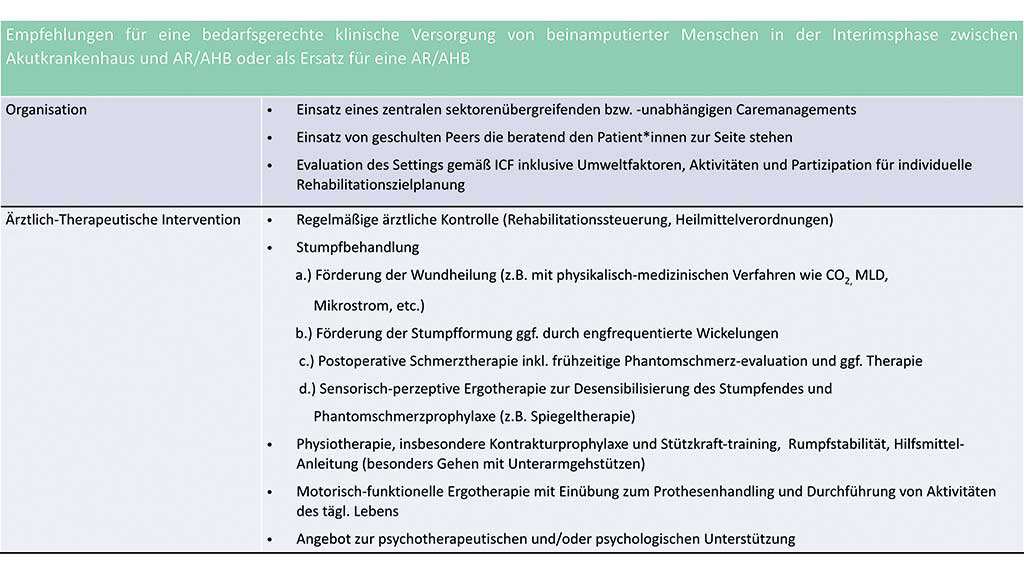 Der optimale Zeitpunkt für die Anschlussrehabilitation ist aus Sicht der Autoren gekommen, wenn die Rehabilitand:innen mit ihrer vorhandenen Interimsprothese bereits einige Tage mobil sind, eventuelle durch Volumenschwankungen bedingte Anpassungen durchgeführt wurden und der Stumpf belastbar ist. Nur so kann das Kernziel der Rehabilitation, „sicheres Gehen mit der Prothese“, in der anschließenden stationären oder ganztagsambulanten Rehabilitation erreicht werden. Weitere zu vertiefende Reha-Ziele über die Interimsphase hinaus waren die Kontrakturprophylaxe, allgemeine und spezifische Kräftigung der verbliebenen Extremitäten, Erhalt und Ausbau von Koordination und Gleichgewicht sowie Herz-Kreislaufkonditionierung.