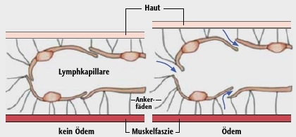 Die Auf­nah­me der Lymph­flüs­sig­keit in die Kapil­la­re selbst erfolgt durch den soge­nann­ten Fall­tür­ef­fekt 1: Bei erhöh­ter Fil­tra­ti­on öff­nen sich die Kapil­lar­klap­pen, da im Kapil­lar­in­ne­ren ein nied­ri­ge­rer Druck vor­herrscht. Die Flüs­sig­keit strömt ein und sorgt für Druck­aus­gleich, wes­halb sich die Klap­pen wie­der schlie­ßen (Abb. 1 links). Durch die akti­ve vaso­mo­to­ri­sche Wei­ter­lei­tung (Mus­kel­ak­ti­vi­tät) wird der Fol­ge­ab­schnitt geleert, die Unter­druck­si­tua­ti­on wie­der her­ge­stellt, und der Vor­gang kann sich wie­der­ho­len. Die Flüs­sig­keits­auf­nah­me funk­tio­niert also nur, wenn der Fol­ge­ab­schnitt geleert ist bzw. wer­den kann, da nur dann die Ven­til­funk­ti­on der Kapil­la­re wirk­sam ist. Bei einem bspw. ödem­be­ding­ten Auf­quel­len der Haut­schicht (Abb. 1 rechts) ist die beschrie­be­ne Mecha­nik außer Funk­ti­on. Durch Druck von außen müs­sen nun zunächst die Fol­ge­ab­schnit­te geleert wer­den, bevor die Flüs­sig­keit aus dem Ödem­ge­biet abflie­ßen kann. Ist die Lymph­ka­pil­la­re gar unter­bro­chen, bspw. durch Kno­ten­re­sek­ti­on infol­ge einer Krebs­ope­ra­ti­on oder durch patho­lo­gi­sche oder strah­lungs­be­ding­te Gewe­be­ver­än­de­run­gen (Tumo­re, Fibro­sen), ist der Abfluss unter­bun­den und kann nur über Neben­we­ge (Anas­to­mo­sen, Was­ser­schei­den), unter­stützt durch Kom­pres­si­ons­the­ra­pien, erfol­gen. Die in den Lymph­ge­fä­ßen auf­tre­ten­den Strö­mungs­ge­schwin­dig­kei­ten sind ver­gleichs­wei­se gering, die recher­chier­ten Drü­cke in den Lymph­ge­fä­ßen wer­den mit etwa 1–10 mmHg ent­spre­chend 1, 3 –13 , 3 h Pa ( bzw. mbar) ange­ge­ben 2 3.