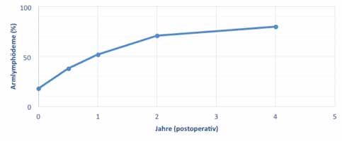 Nach Her­pertz 4 liegt die Wahr­schein­lich­keit eines Arm-Lymph­ödems nach Mas­tek­to­mie bei 80 % inner­halb von 4 Jah­ren (Abb. 2), meist bedingt durch Nar­ben- und strah­lungs­be­ding­te Gewe­be­schrump­fung. Durch neue Ope­ra­ti­ons­tech­ni­ken (Wäch­ter­kno­ten-/Sen­ti­nel­kno­ten­bi­op­sie, brust­er­hal­ten­de OPs) wer­den nicht mehr bis zu 50 Lymph­kno­ten, son­dern nur noch befal­le­ne Wäch­ter­kno­ten ent­fernt. Damit sinkt der Anteil der Armö­de­me von 64 auf 10 bzw. unter 5 % (ent­spre­chend etwa 5.000 Pati­en­tin­nen) 5). Lei­der wird aber auch eine Zunah­me der Brust­öde­me beob­ach­tet 6 7, da bereits die Unter­bre­chung von 1 bis 2 Kol­lek­to­ren aus­rei­chend ist, um deren Aus­bil­dung zu provozieren.