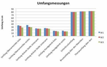 In Abbil­dung 4 sind bei­spiel­haft die rele­van­ten Mess­wer­te für Arm‑, Brust- und Tho­rax­be­reich über drei Ver­suchs­wo­chen (W1–W3) einer aus­ge­wähl­ten Pro­ban­din dar­ge­stellt, die nach Sta­tus­er­he­bung eine voll­stän­di­ge, beid­sei­ti­ge Brust­am­pu­ta­ti­on mit eben­falls beid­sei­tig auf­tre­ten­dem Arm-Lymph­ödem angibt und sich der­zeit kei­ner Kom­pres­si­ons­the­ra­pie oder MLD unter­zieht. Erwar­tungs­ge­mäß zei­gen sich kei­ne Ver­än­de­run­gen bei Brust- und Tho­ra­x­um­fang. Dage­gen tre­ten im Arm­be­reich deut­li­che Rück­gän­ge auf. Ob die­se Ver­än­de­rung allein oder in Kom­bi­na­ti­ons­wir­kung auf das Tra­gen der spe­zi­el­len Mas­sa­ge­pro­the­se zurück­zu­füh­ren ist, muss noch durch intra­in­di­vi­du­el­le Ver­gleichs­mes­sun­gen sowie mit einem grö­ße­ren Kol­lek­tiv abge­si­chert wer­den. Der von vie­len Trä­ge­rin­nen der Mas­sa­ge­pro­the­se geäu­ßer­te posi­ti­ve Effekt der beson­de­ren Kon­takt­flä­chen­ge­stal­tung ist hier­bei aber erst­mals objek­tiv erkennbar.