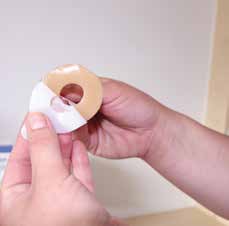 Stomazubehör wie Stomapasten, Modellierstreifen, Hautschutzplatten und Hautschutzringe können Hautunebenheiten wie zum Beispiel parastomale Hautfalten oder Narben ausgleichen (Abb. 7 u. 8). Sie lassen sich mit den Stomaversorgungssystemen kombinieren, dichten zusätzlich ab und können vor Stomaleckagen schützen. Die Materialien lassen sich je nach individuellem Bedarf leicht in die gewünschte Form modellieren oder mit Ausnahme der Stomapaste zuschneiden. Treten parastomal oberflächliche Läsionen auf, absorbiert ein dünn aufgetragener Hydrokolloidpuder, auch „Stomapuder“ genannt, Feuchtigkeit. Ein Stomagürtel kann eine Stomaversorgung mit zusätzlichem „Andruck“ fixieren. Sowohl zur Unterstützung der Bauchwand als auch zur Prävention einer parastomalen Hernie können Ärzte das Tragen einer Bauchbinde mit einer Stomaöffnung verordnen.
