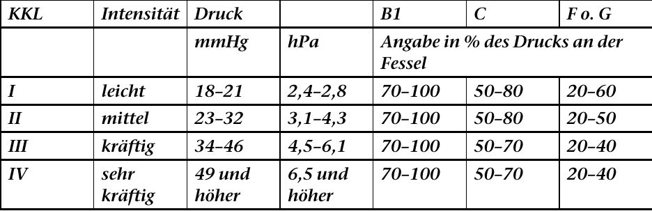 Die Höhe des Kompressionsdrucks bei der Kompressionsbehandlung richtet sich in Deutschland nach den Kompressionsklassen (siehe Tab. 1). Der Kompressionsdruck sinkt vom Knöchel zur Leiste hin kontinuierlich ab. Im Bereich der Leiste (G‑Maß) liegt er nur noch bei 20–60 % in Klasse I, bei 20–50 % in Klasse II und bei 20–40 % bei Kompressionsstrümpfen der Klassen III und IV. Praktisch bedeutet dies, dass bei einem Kompressionsstrumpf der Klasse II, der einen Kompressionsdruck beispielsweise von 25 mmHg im B‑Maß aufweist, am Oberschenkel nur noch Druckwerte von 5 mmHg erreicht werden müssen. Derartig niedrige Kompressionsdruckwerte liegen kaum höher als die im Bereich der Gummiabschlüsse bei normalen Feinstrümpfen.