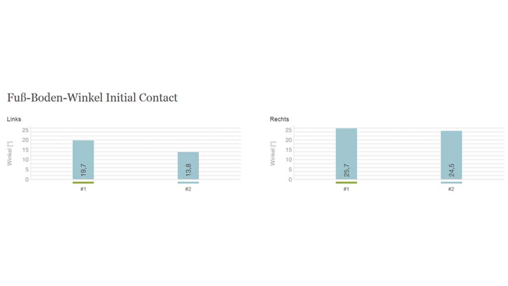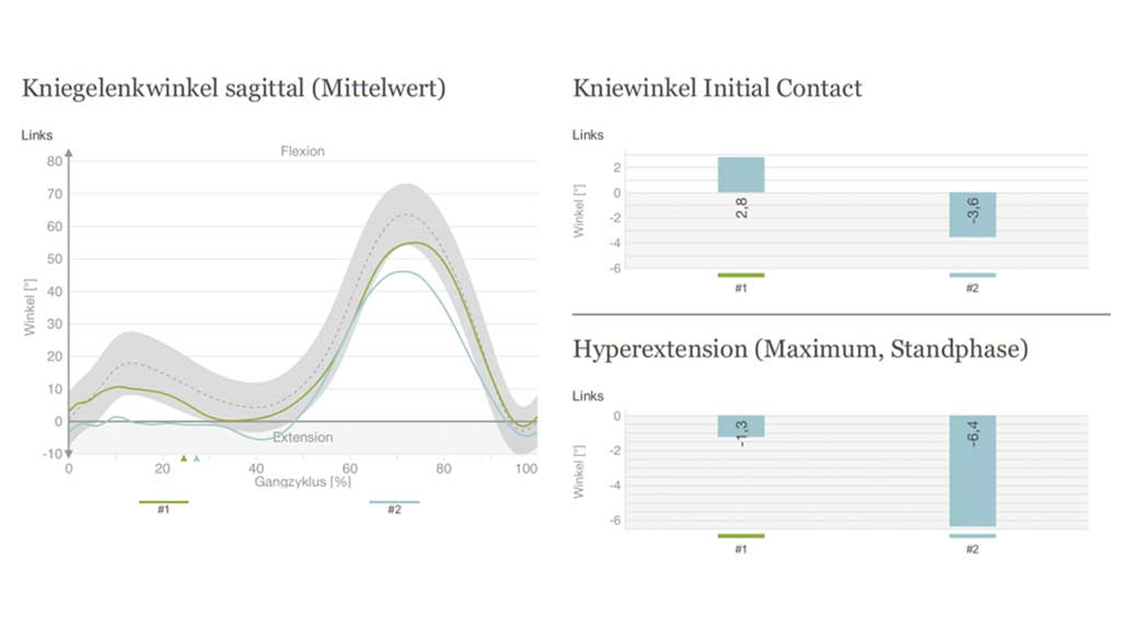Beispielhaft zeigt Abbildung 1 einen Vergleich zwischen zwei Messungen: die eine mit Funktioneller Elektrostimulation (FES; „Bioness L300 Go“), die andere ohne Versorgung. Dargestellt ist der Unterschied des Fuß-Boden-Winkels während „initial contact“ bei einer Vergleichsmessung im Gehen mit (grün) und ohne FES (blau). Beim betroffenen linken Vorfuß konnte mit FES eine stärker ausgeprägte Dorsalextension (+ 42 %) und somit eine bessere Anhebung des Fußes gemessen werden. Dies führt in den folgenden Gangphasen zu einem besseren Abrollen, und die Werte nähern sich sichtlich denen des rechten – nicht betroffenen – Vorfußes an. Durch das verbesserte Abrollverhalten des Fußes kann die natürliche Stoßdämpfungsfunktion in „loading response“ besser realisiert werden. Dies führt unmittelbar zu einer Entlastung der beteiligten Strukturen und beugt Folgeschäden vor. Zusätzlich zum Fuß-Boden-Winkel sind in Abbildung 2 die Kniegelenkparameter derselben Messungen dargestellt. Sowohl bei „initial contact“ als auch über die Standphase konnte mit der FES-Versorgung eine stärkere Knieflexion erreicht werden, was einen physiologischeren Ablauf kennzeichnet und das Knie stabilisiert. Zusätzlich konnte die Hyperextension in der Standphase im unversorgten Zustand deutlich reduziert werden. In der folgenden Schwungphase zeigt sich bei der Messung mit FES-Versorgung eine größere Knieflexion. Insgesamt nähert sich der Kniewinkelverlauf über den gesamten Gangzyklus den Normwerten einer physiologischen Kohorte an. Diese Messwerte machen insgesamt deutlich, dass bei den beiden vorliegenden Messungen die FES-Versorgung zu einer starken Verbesserung des Gangbildes führt.