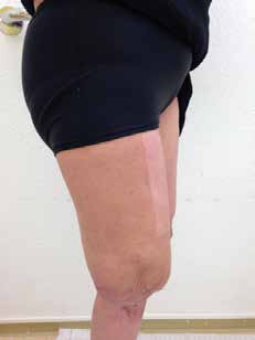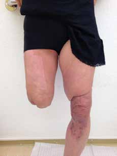 Das Stumpfende ist durch die traumatische Amputation mit einer tiefliegenden Narbe bedeckt. Durch die notwendigen Hauttransplantationen für das linke Bein wurde Meshgraft vom Oberschenkel genommen (Abb. 2a u. b). Auch dies verzögerte die Prothesenversorgung. Zur Zeit der prothetischen Versorgung kann der Muskelstatus als ausreichend bezeichnet werden. Der Bewegungsumfang ist durch die begleitende physiotherapeutische Betreuung gut. Eine Stumpfflexion von 10 Grad und eine Stumpfadduktion von 6 Grad sind anatomisch vorgegeben und wurden prothetisch umgesetzt.