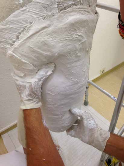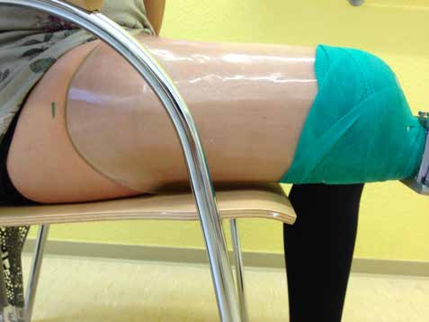 Die fachärztliche Verordnung einer wasserfesten Prothese eröffnete die Gelegenheit, ein alternatives Schaftdesign zu testen. Der Abdruck wurde nach Gipsabdruck erstellt (Abb. 3) und nach den Wirkprinzipien des MWK-Schaftsystems modelliert. Die wasserfeste Prothese wurde also mit einem MWK-Badeschaft ausgestattet, welcher von der Patientin schnell als die bevorzugte Lösung angenommen wurde. Schon während der Anprobephase war eine deutliche Komfortsteigerung für die Anwenderin zu spüren (Abb. 4a–c). Aus bereits gesammelten Erfahrungen von Versorgungen mit dem Milwaukee-TF-Schaft war nicht davon auszugehen, dass die Anwenderin die knöcherne Verblockung aus ihrem Definitivschaft vermissen würde. Der deutliche Zugewinn an Hüftbewegungsfreiheit wird von der Patientin als größter Vorteil gesehen, gefolgt von Bettungskomfort und dem angenehmen und natürlicheren Sitzen, da das Becken vollkommen frei von drückenden und hebelnden Schafträndern ist. Dieses bestätigte sie sofort nach Erhalt des definitiven MWK-Badeschaftes (Abb. 5a u. b). Das obere Drittel der Schafteintrittsebene wurde speziell beschichtet, sodass die Haftung der Oberfläche reduziert wird. Die restlichen zwei Drittel der Schaftoberfläche besitzen genug Haftung zur optimalen Ansteuerung und Kontrolle der Prothese, die auch dem gewünschten Bewegungsausmaß im Wasser keinen Abbruch tut.