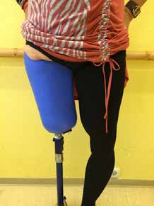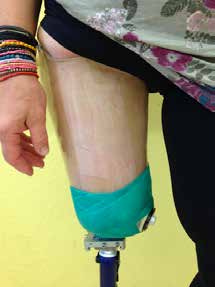 Eine Interimsprothese wurde erstmalig zweieinhalb Monate nach der Amputation angepasst. Die ungewöhnliche Verzögerung war notwendig, um die Versorgung des erhaltenen Beines mit externem Fixateur nicht zu beeinträchtigen. Nach erfolgreichem Test wurde der Interimsschaft in anatomischer Form mit Silikon-Liner gefertigt. Ein gesperrtes Kniegelenk und ein Karbonfederfuß in Erwartung einer baldigen Umstellung auf ein aktiveres Kniegelenk vervollständigten die Interimsprothese. Die Versorgung erlaubte der Patientin die Wiedererlangung des sicheren Stehens (das linke Bein eignet sich nicht als Standbein) und schließlich die Teilnahme an Gehtraining und Physiotherapie, im Rahmen derer die gesperrte Kniesituation abgeschult werden konnte. Im weiteren Versorgungsverlauf konnten die Knie- und Fuß-Passteile entsprechend an das neu gewonnene Aktivitätsprofil angepasst werden. Nachdem sich das Stumpfvolumen stabilisiert hatte, wurde schließlich auch die definitive Prothese mit einem anatomischen Schaft verordnet und gefertigt. Hierbei wurde auf eine Liner-Versorgung verzichtet, da die Anwenderin jetzt in der Lage war, mit Hilfe einer Anziehtüte einen Prothesenschaft anzuziehen.
