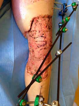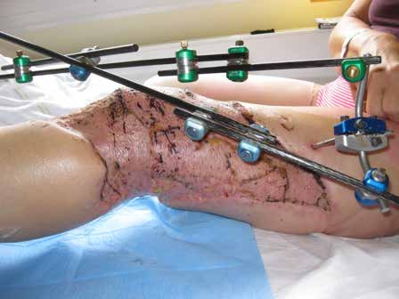 Die ansonsten gesunde Patientin überlebte die traumatische Amputation ihres rechten Beines im Oberschenkel nach einem beruflichen Verkehrsunfall im Alter von 54 Jahren. Kollaterale Verletzungen des linken Beines, die eine externe Fixierung erforderten (Abb. 1a u. b), trugen zu einem langen Krankenhausaufenthalt bei und beeinträchtigen weiterhin die Funktion dieses Beines. Bis zur Amputation pflegte die Patientin einen aktiven Lebensstil (Berufstätigkeit, Schwimmen, Garten, Wandern), den sie so weit als möglich wieder aufnehmen möchte.