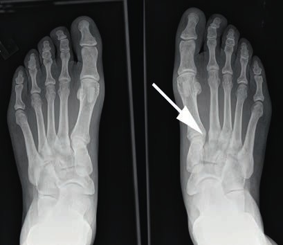 - Bei einer Grad-II-Verletzung findet sich in den Röntgenaufnahmen unter Belastung eine Diastase zwischen dem I. und II. Mittelfußknochen von 2 bis 5 mm. Die Seitenaufnahme des Fußes im Seitenvergleich ist unauffällig (Abb. 3). Im MRT kann eine partielle Ruptur der Bänder nachgewiesen werden. Nicht selten finden sich ab Grad-II-Verletzungen im MRT Ödeme der subchondralen Spongiosa der angrenzenden Gelenkflächen.