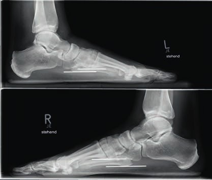 - Bei Grad-III-Verletzungen liegt eine Zerreißung der dorsalen und plantaren Anteile des Lisfranc-Bandkomplexes vor. Dies bedingt eine ausgeprägte Instabilität des ersten Strahls. In den belasteten Röntgenaufnahmen ist eine Diastase zwischen dem I. und II. Mittelfußknochen sowie ein Absinken des Längsgewölbes erkennbar. Im Seitenvergleich lässt sich dies am Abstand der plantaren Kortikalis des Metatarsale I in Beziehung zur plantaren Kortikalis des Metatarsale V erkennen (Abb. 4).