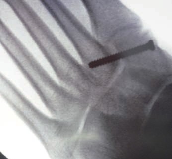 Kanülierte Schrauben erleichtern das Vorgehen, wobei grundsätzlich auch Standard-Kleinfragmentschrauben verwendet werden können. Die in der Literatur beschriebene Verwendung von 2,0‑mm-Kirschnerdrähten hat sich bei den Verfassern nicht bewährt. Hier besteht ein erhebliches Risiko der Lockerung und Dislokation 32. Thordarson und Hurvitz (2002) 33 berichten über den Einsatz von resorbierbaren Schrauben, Hu et al. (2014) sowie Hsu et al. (2015) über den Einsatz einer das Tarsometatarsale-I-Gelenk überspannenden Platte 34 35.