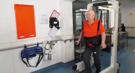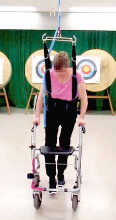 Neben diesen hochtechnisierten Behandlungsformen sind Entlastungssysteme, die das geschützte Gehen über Grund mit Hilfe von in Schienensystemen laufenden Gurten ermöglichen, eine aussichtsreichere Behandlungsform (Abb. 3). Ähnlich der Therapie auf dem Laufband ermöglichen sie den Patienten mit variabler Gewichtsentlastung das Gehen im Raum. Um die Limitation der Schienensysteme zu überwinden, wurden mobile Gewichtsentlastungssysteme mit Gurten entwickelt, die die Entlastung des Patienten der aktuellen Anforderung anpassen (Abb. 4) 10. Sie sind unter den Bezeichnungen „Andago®“ und „LiteGait®“ auf dem Markt.