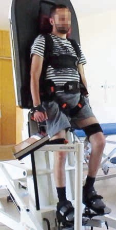 Deshalb lag es nahe, für diese Problematik Therapiehilfsmittel zu entwickeln, die den Patienten schon in dieser frühen Phase der Rehabilitation unterstützen. Ausgehend von der Idee eines Kipptisches sind Stehbretter schon lange im klinischen Einsatz – sie erlauben die schonende Aufrichtung des Patienten in kleinen Schritten. Aufgrund der notwendigen Fixierung des Patienten können auf diesen Stehbrettern aber keine gleichzeitigen Bewegungen der unteren Extremitäten erfolgen – weder passiv noch aktiv. Ursprünglich von der Vorstellung ausgehend, Schrittmacherzentren für die Schreitfunktion auf spinaler Ebene anzuregen, wurde mit dem „Erigo®“ (Abb. 1) ein Stehbrett entwickelt, bei dem die Beine durch Manschettensysteme und Linearmotoren passiv geführt werden. Ein Therapievorteil bezüglich der später erreichten Gehfähigkeit hat sich bislang zwar nicht nachweisen lassen. Es zeigte sich aber rasch, dass diese Therapieform gerade bei hoch gelähmten Patienten deutlich zur Verbesserung der Kreislaufsituation in der Initialsituation beitragen kann 4.