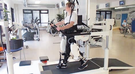 Es ist dem Entwicklungsteam um Gerry Colombo aus Zürich zu verdanken, dass 2001 ein erstes stationäres Exoskelett entwickelt wurde, das neben der Gewichtsentlassung auch eine automatisierte aktive Führung der unteren Extremitäten ermöglichte. Es wurde unter dem Namen „Lokomat®“ (Abb. 2) auf den Markt gebracht und bis zum heutigen Datum immer weiter entwickelt. Mittlerweile sind auch Konkurrenzprodukte erhältlich. Dieses Trainingsverfahren erlaubt ein dem Leistungsvermögen des Patienten gut angepasstes repetitives Ausdauertraining in nahezu allen Phasen der Erstrehabilitation 5.