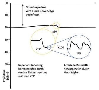 Wie der Abbildung zu entnehmen ist, ist die resultierende Bioimpedanz abhängig von arteriellen und venösen Blutvolumenvariationen und setzt sich aus drei Komponenten zusammen: