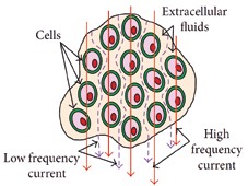 Die elektrischen Eigenschaften biologischer Gewebe werden generell als „Bioimpedanz“ bezeichnet. Dabei ist jedoch zu beachten, dass die Bioimpedanz nicht nur von der biochemischen Zusammensetzung der analysierten Gewebe, sondern auch von der Frequenz des eingehenden Stroms abhängig ist [1–4]. Grund dafür ist die Basiskomposition der Zellen, aus denen die Gewebe zusammengesetzt sind. Wie in Abbildung 1 dargestellt, hat jede Zelle eine phospholipidische Membran (Zellmembran), die eine Abgrenzung der Zelle gegenüber der äußeren Welt schafft. Innerhalb und außerhalb der Zelle gibt es leitfähige, elektrolytische Flüssigkeiten; andererseits kann die Zellmembran elektro physiologisch als Plattenkondensator angesehen werden, dessen spezifische Kapazität bei Membranen verschiedener Zelltypen im Bereich von etwa 1 μF · cm−2 liegt. Deshalb lässt die Zellmembran niedrige Stromfrequenzen nicht hindurch.