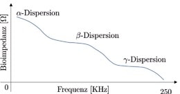 - Bereich γ‑Dispersion: In diesem Frequenzbereich kann der Strom durch die Zellmembran der Gewebe hindurchfließen. Der Widerstand ist in diesem Fall lediglich eine Konsequenz des Ionentransports durch die Zellmembran selbst, während die tatsächliche Leitfähigkeit von den intra- und extrazellulären Flüssigkeiten abhängig ist.