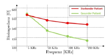 Typische Messfrequenzen für eine MFBIA sind 5, 50, 100 und 200 KHz. Wenn diese Punkte im Frequenz-Bioimpedanz-Raum dargestellt werden, erhält man sogenannte Multifrequenz-Bioimpedanz-Kurven (MFBIA-Kurven). Bei gesunden Patienten sind diese durch eine steile Abnahme mit steigender Frequenz gekennzeichnet, weil die Menge an Wasser im Zytoplasma und im Extrazellraum gut ausbalanciert ist. Dagegen ist die MFBIA-Kurve bei Patienten mit erhöhtem Mortalitätsrisiko wegen der unausgeglichenen Menge an intra- und extrazellulärem Wasser relativ flach. Somit stellen die MFBI-Kurven eine einfache grafische Lösung zur intuitiven, direkten Auswertung der Patienten gesundheit dar (siehe Abb. 5).