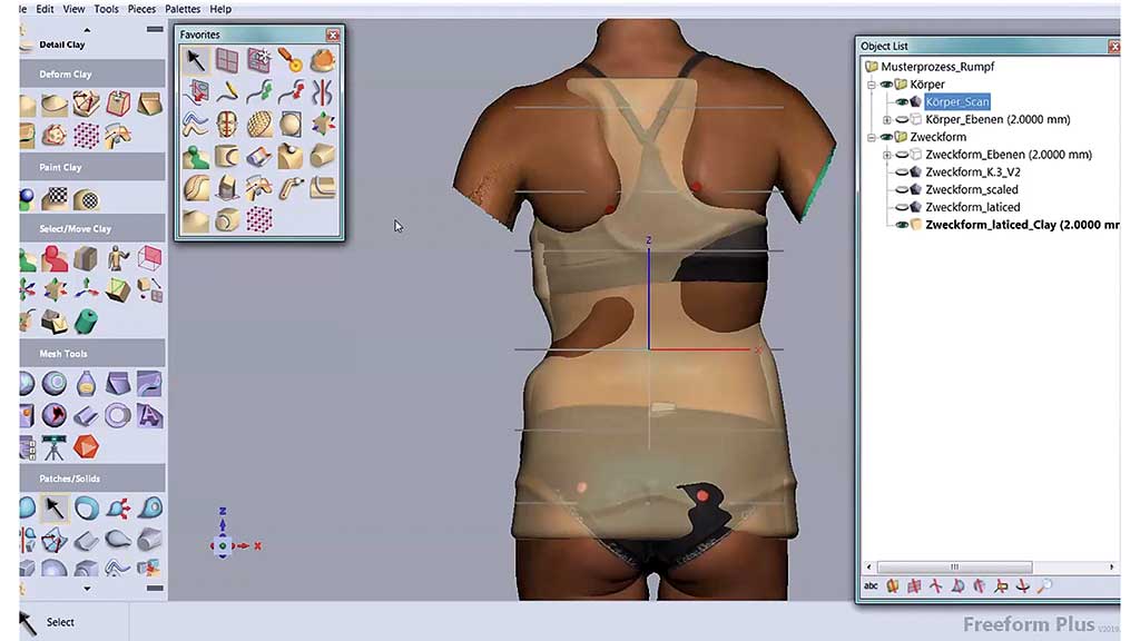 Eine weitere Möglichkeit besteht darin, den Körper bewusst in Fehlstellung zu erfassen und im Anschluss mit Bibliotheksmodellen zu arbeiten. Die Überlagerung der Bibliotheksform mit dem unkorrigierten Körperscan (bspw. in Freeform) ermöglicht die nachträgliche Interpretation der Zweckform in Durchsicht.
