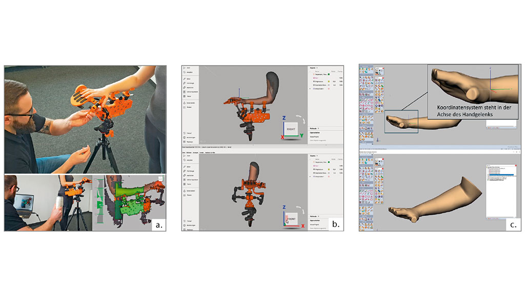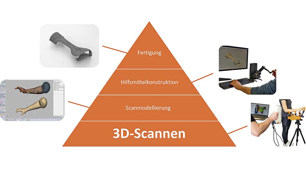 Das Arbeiten mit 3D-Scanwerkzeugen erleichtert die Erstellung von 3D-Scans entscheidend und stellt hinsichtlich der Umsetzbarkeit eines digitalen Gesamtprozesses ein Schlüsselelement dar. Die Möglichkeit, ein Körperteil indikationsspezifisch zu positionieren und direkt zu digitalisieren, mindert schnittstellenbedingte Fehlerpotentiale (Austausch zwischen Außendienst und Produktion) und ermöglicht eine unverfälschte Erfassung des Körperzustandes in der jeweiligen Stellung. Lässt sich das Körperteil aufgrund mittlerer bis starker Spasmen auch mit Scanwerkzeug nicht gänzlich in die gewünschte Stellung bringen, besteht immer die Möglichkeit einer nachträglichen, digitalen Stellungskorrektur z. B. mit der Software Geomagic Freeform.