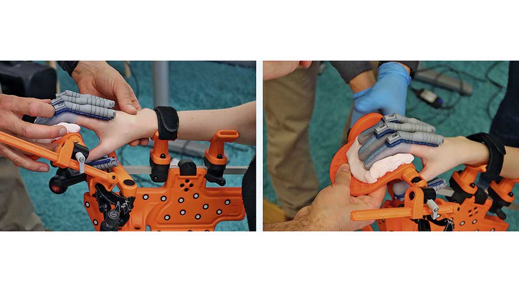 Über verschiedene Standardauflagen für die Finger lassen sich bereits beim Scannen die Anlageflächen des späteren Hilfsmittels definieren. Bei der Positionierung der Patientenhand empfiehlt es sich zudem, den Daumen über einen separaten Gelenkarm zu fassen und diesen gesondert nach den individuellen Patientenbedürfnissen zu fixieren. Sofern eine individuelle Bettung der Finger benötigt wird, bietet es sich an, mit Knetsilikon zu arbeiten (Abb. 3).
