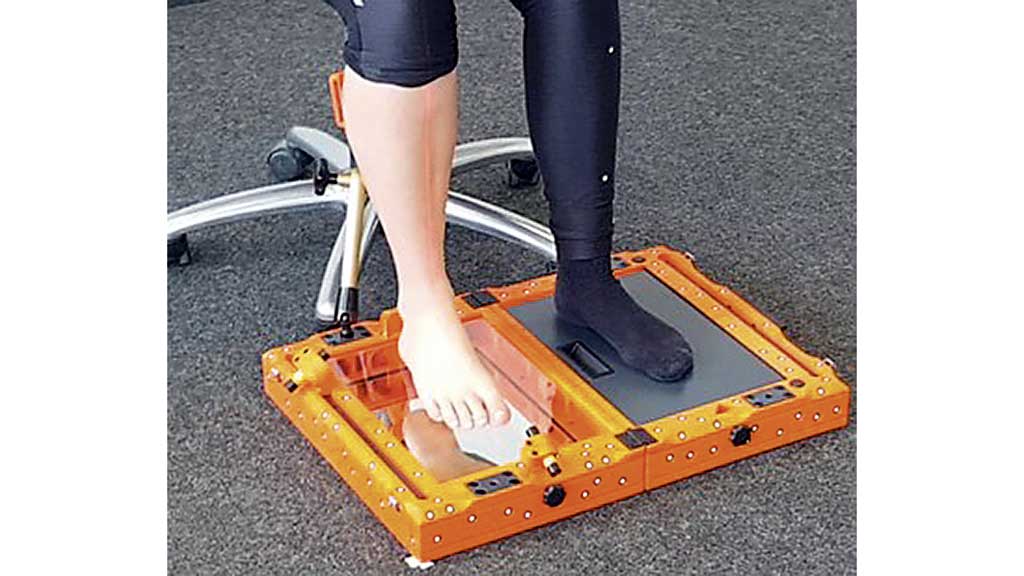 Ist der Rumpfscan bereits im Vorfeld durch ein definiertes Targetsetup und somit auch durch ein definiertes Koordinatensystem immer parallel zur Bodenebene ausgerichtet, lassen sich versorgungsrelevante Informationen wie bspw. die Rotation des Beckens oder Schulterschiefstände stets mit Bezug zur Bodenebene interpretieren. Dies ist im Vergleich zur konventionellen Abformung mittels Gipstechnik ein entscheidender Vorteil. Die Positionierung des Patienten auf dem Werkzeug kann durch die Verwendung eines Fersenanschlags erleichtert werden (Abb. 8). Um die Arme aus dem Scanbereich herauszuhalten, können Unterarmgehstützen verwendet werden.