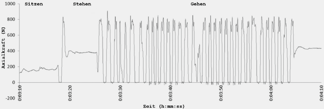 Diese Messvariablen lassen sich anschließend hinsichtlich ihrer Varianz über mehrere Schritte hin auswerten 9. Die ungewöhnliche Fülle an verfügbaren Daten, die durch diese kontinuierliche Messung erfasst werden, muss reduziert werden, um die relevanten Informationen zu extrahieren. Ein Blick auf die verschiedenen Ganganalyse-Kurven erlaubt eine erste einfache Sequenzierung des Bewegungsablaufes. Abbildung 3 zeigt einen einminütigen Ausschnitt aus dem Messdatensatz für die axiale Kraft, also die Kraft längs des Schienbeins, gemessen während einer Ganganalysesitzung. Diese Variable ist besonders gut verwertbar zur Identifikation von Aktivitäten. Es ist leicht erkennbar, wann der Testpatient saß (wenn die gemessene axiale Kraft nahe des Nullniveaus verharrt), ging (periodisch wiederholte typische vertikale Kraft-Kurve) und stand (Kraft verharrt bei etwa 50 % des Maximalwertes). Neben der jeweiligen Gangphase, Schrittfrequenz und Schrittvarianz erlaubt die Messvariable „Axialkraft” auch Aufschluss über das Terrain. Die Form der Kurve ändert sich beispielsweise markant beim Treppensteigen, wobei sich je nach Richtung die Signatur ändert.