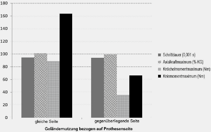Bei der Wahl des Handlaufes spielt vermutlich die bevorzugte Hand eine wichtigere Rolle als das bevorzugte Bein. Die ermittelten Unterschiede vor allem in der Kniemomentvarianz deuten allerdings darauf hin, dass bei entsprechend diagnostizierter Sturzanfälligkeit die Verwendung des prothesenseitigen Handlaufs empfehlenswert ist, unabhängig von der Händigkeit. Die Verwendung des gegenüberliegenden Handlaufs schien allgemein die Gehgeschwindigkeit zu verringern, vor allem beim Treppabsteigen, und die gemessenen Knieund Sprunggelenkmomente beim Treppaufsteigen zu erhöhen.