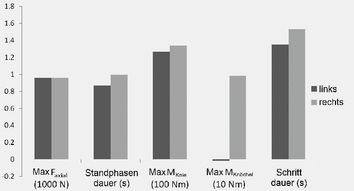 Kontinuierliche iPecs-Messungen wurden durchgeführt, während die Probanden jeweils in ihrer bevorzugten Geschwindigkeit in verschiedenen Umgebungen (innerhalb des Labors, auf Treppen, im Freien) gingen. Parameter wie Standphasendauer‑, Knie- und Sprunggelenkmomente sowie Axialkraft wurden über die jeweiligen Teilabschnitte gemittelt. Beide Beine wurden mittels MANOVA verglichen. Für jede Aufgabe wurde die mittlere Differenz der Parameter basierend auf einer Stichprobe von jeweils 10 Schritten berechnet. Abbildung 5 zeigt die bilateralen Differenzen zwischen den Beinen beim Gehen in der Ebene für einen der Probanden.