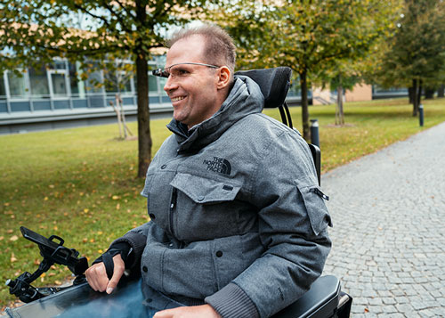 Leverenz: Munevo Drive ist eine neu entwickelte Smartglass-Anwendung, die komfortabler ist als eine Kinnsteuerung sowie mehr Möglichkeiten bietet. Anders als bei der Kinn- oder Hinterhauptsteuerung hängt die Möglichkeit, den Rollstuhl zu steuern, nicht mehr von der Positionierung des Nutzers ab. Veränderungen der Sitzposition oder der eigenen Bewegungsumfänge gleicht der Nutzer selbstständig durch Kalibrierung der App aus. Das Systemist zudem viel kleiner und damit weniger sperrig als die Kinnsteuerungsmodule bzw. ‑apparate. Das erleichtert Physiotherapeuten und Pflegepersonal die Arbeit, da das Herausheben aus dem Rollstuhl unkomplizierter ist. Darüber hinaus kann sich der Betroffene den Rollstuhl über die Smartglass-App ans Bett heranholen.