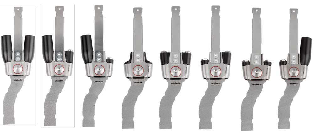 - Anschlagmodul: Mit dem Modul für den einstellbaren Anschlag kann stufenlos der Dorsal- oder Plantaranschlag eingestellt werden (Abb. 1c). Ein Anwendungsbereich für das Anschlagmodul ist die postoperative Versorgung, z. B. nach Fußumstellungsoperationen. Damit lässt sich die Bewegung des oberen Sprunggelenkes über ein vorderes und hinteres Anschlagsmodul temporär einschränken. Entsprechend dem Heilungsverlauf können die Anschlagsmodule dann durch “Reaction-” oder Feder-Module ausgetauscht werden, ohne dass eine neue Orthesenanfertigung erforderlich wird. Dieses Vorgehen kann aber auch bei Patienten gewählt werden, für die zunächst eine relativ rigide Orthese mit Anschlagmodulen mehr Standsicherheit bedeutet, wie es beispielsweise bei zentralen Paresen mit eingeschränkter Tiefensensibilität der Fall sein kann. Die Orthesen werden dann entsprechend dem Therapiefortschritt mit den “Reaction”-Modulen oder mit Feder-Modulen aufgerüstet.